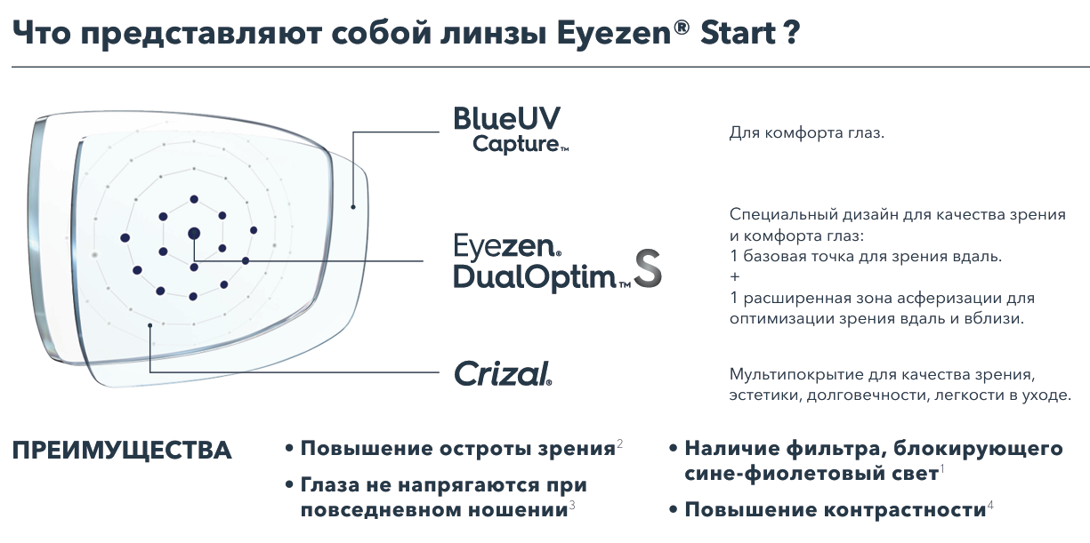 1. Сине-фиолетовый свет характеризуется длиной волны в диапазоне от 400 до 455 нм (согласно стандарту ISO TR 20772:2018). 2. Внутренние расчеты отдела исследований и разработок компании «Эссилор» от 2022 года: увеличение площади линзы с низкими аберрациями по сравнению с обычными однофокальными линзами. 3. Исследования опыта потребителей линз Eyezen® с участием независимых сторон [Eyezen® Start (Rx) — 2018 г. — Франция — количество участников — 49 / Eyezen® Start (Stock) — 2020 г. — Франция — количество участников — 52]. 4. По сравнению с обычными однофокальными линзами. Исследования опыта потребителей линз Eyezen® с участием независимых сторон [Eyezen® Start (Rx) — 2018 г. — Франция — количество участников — 49 / Eyezen® Start (Stock) — 2020 г. — Франция — количество участников — 52].